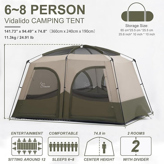 Vidalido Tents,6-8 Person Camping Tent with Extended Vestibule,2 Room Weather Resistant Family Tents,Easy Install Waterproof Outdoor Tent for Backpacking and Camping Hiking