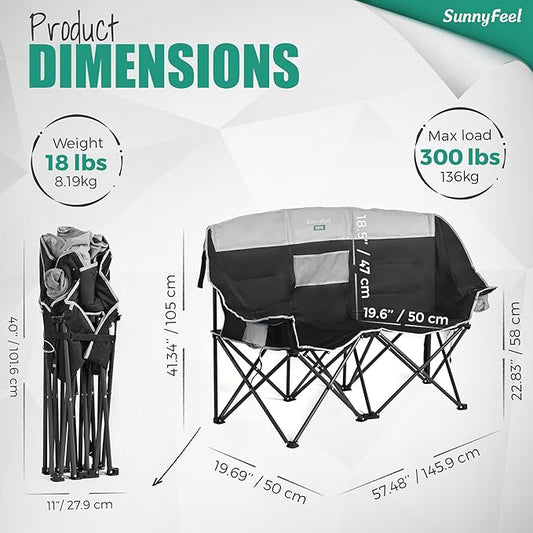 SUNNYFEEL Heated Double Camping Chair, Oversized Folding Loveseat Chair, Heavy Duty Portable/Foldable Lawn Chair for Beach/Outdoor/Travel/Picnic, Fold Up Camp Chairs for Adults 2 People