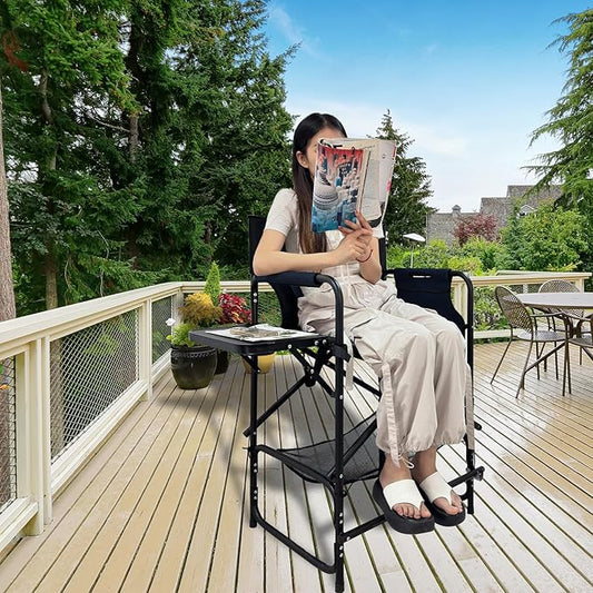 Tall Folding Directors Chair with Side Table 26.77" Seat Height Foldable Camping Chair Bar Stool for Makeup Artist Face Painting with Footrest and Storage Pocket Supports 350LBS