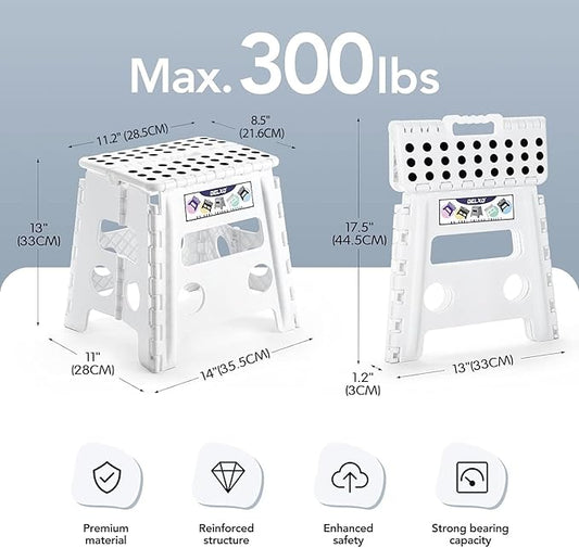 Delxo 13" Folding Step Stool for Kids and Adults, Non-Slip Foldable Step Stools with Handle,Plastic Portable Folding Stool for Bathroom,Bedroom,Kitchen,Hold up to 300lbs White