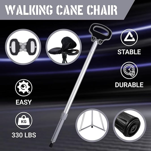 Walking Stick With Seat - Adjustable Portable Cane, Foldable Stool With 2 Bases, Pocket Storage Bag and Removable Cushion - Aluminum Lightweight Mobility Aid Crutch