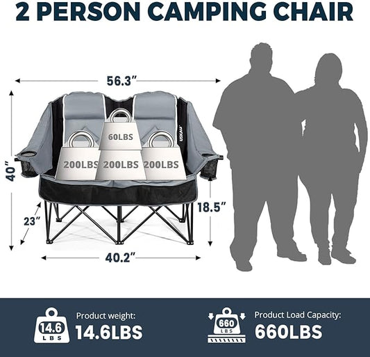 Double Camping Chair for Adults Oversized 2 Person Loveseat Chair for Heavy People, Folding Padded Outdoor Seat with Cup Holders & Carry Bag, 660 lbs Capacity, for Camping, Sports, Backyard