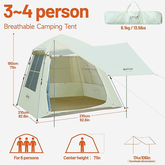 Instant Pop Up Camping Tent - 7'×7' 4 Person, 5-Sided Ventilation, UV-Blocking Top & Hexagonal Awning, Portable for Patio/Beach