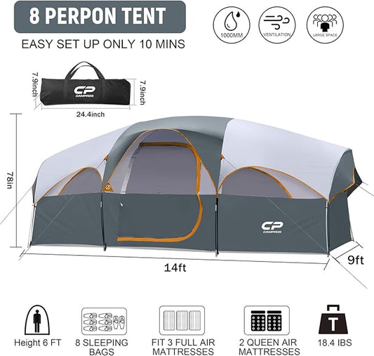 CAMPROS CP Tent 8 Person Camping Tents, Weather Resistant Family Tent, 5 Large Mesh Windows, Double Layer, Divided Curtain for Separated Room, Portable with Carry Bag