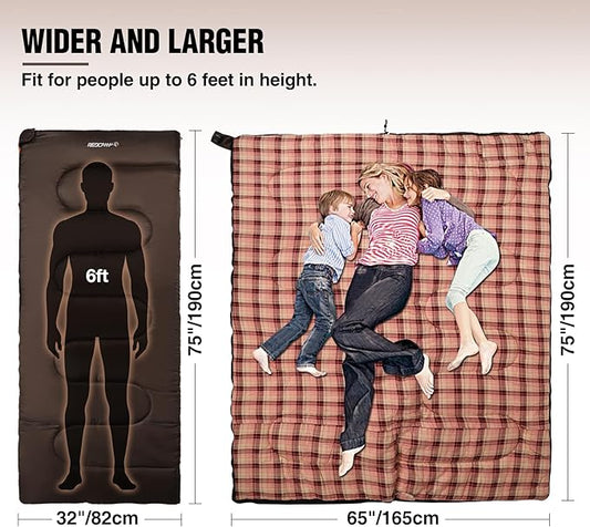 KingCamp Double Sleeping Bag for Adults, Queen Size 2 Person XXL Flannel Sleeping Bag, Waterproof Lightweight Flannel Quilt with 2 Pillows, Perfect for Couples Family Camping Hiking