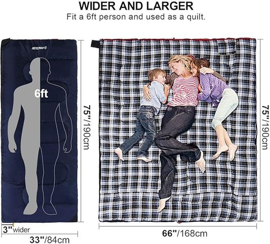 REDCAMP Cotton Double Sleeping Bag for Adults, 2 Person Cold Weather Queen Size Flannel Sleeping Bags for Camping, Black/Navy Blue
