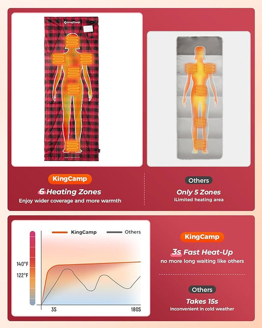 KingCamp 6 Heating Zones Sleeping Bag Liner, 3s Heat-up Portable XL Heated Sleeping Bag Pad for Cold Weather Camping, Hiking, 100% Cotton Flannel, Multi USB Power Supported, Compact Bag Included