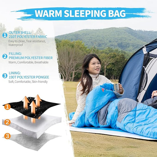 XL 10 Degree Sleeping Bags Waterproof for Adults 350GSM Machine Washable with Compression Sack for 3-4 Season Camping Outdoor