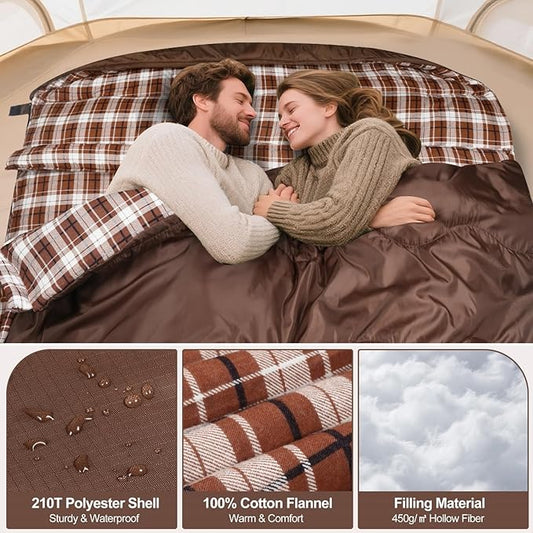 0 Degree Flannel Double Sleeping Bag for Adults, Couples or Family - Winter Queen Size Waterproof & Warm 2-Person Sleeping Bag for Cold Weather Camping, RV Travel