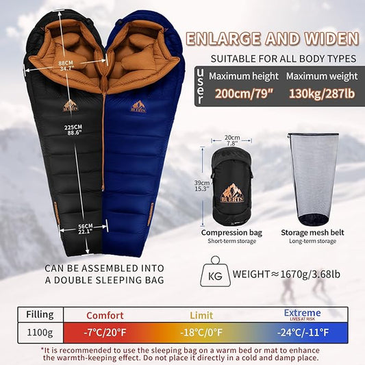 Down Backpacking Sleeping Bag for Cold Weather 32°F to 8°F, XXL Large Ultralight Sleeping Bag Ideal for Adults Camping, Hiking and Backpacking.