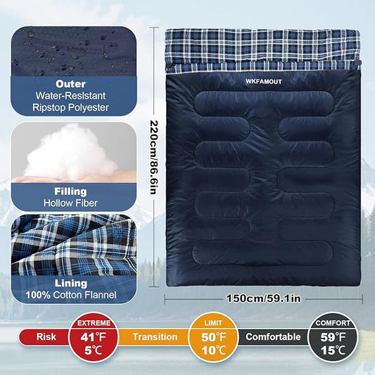 Double Sleeping Bag for Adults Machine Washable 2 Person Camping Sleeping Bag Queen Size Waterproof with Compression Sack for Cold Weather 3-4 Seasons