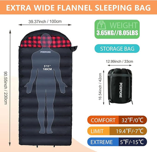 Flannel Sleeping Bag Cotton 0 Degree Cold Weather for Adults XXL Sleeping Bag 4 Season Big and Tall with Compression Sack
