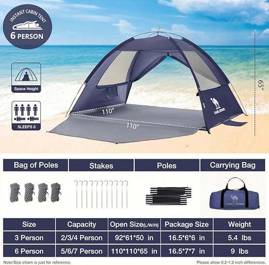 CAMEL CROWN Beach Tent UPF 50+ Sun Shelter for 2/3/5/6 Person, Lightweight Portable Sun Shade with Sand Anchor, Family Beach Day & Outdoor Adventures