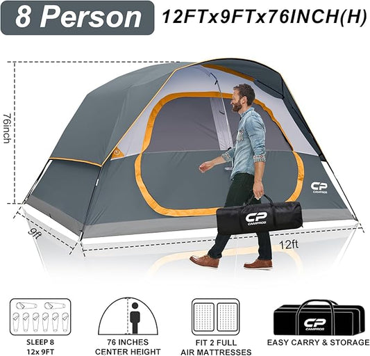 CAMPROS CP Tent 8 Person Camping Tents, Waterproof Windproof Family Tent with Top Rainfly, Large Mesh Windows, Double Layer, Easy Set Up, Portable with Carry Bag, for All Seasons