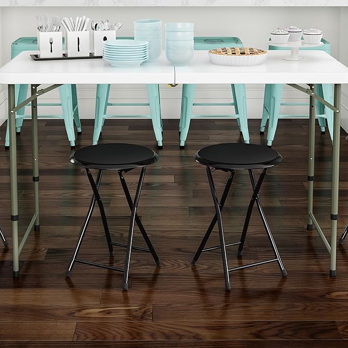 • COMPACT FOLDING STOOLS – The lightweight 18-inch-tall bar stool chairs fold flat for convenient storage in small spaces when not in use. Once folded, the small stools easily fit in any vehicle for convenient travel to parties or performances.