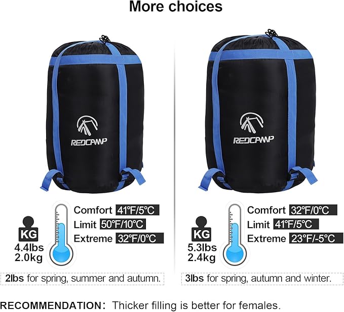 • Temperature Range: 3lbs filling flannel sleeping bags for adults are comfort in 41°F/5°C and fits temperature range 32-50°F/0-10°C. 2lbs filling sleeping bags is comfort in 41°F(0 degree cold weather) and fits temperature range 32-50 °F/0-10 °C. Females are recommended to choose the thicker sleeping bags