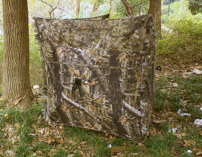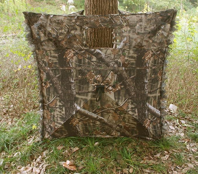• Superior Camouflage and Vision: Enjoy the utmost concealment with our exceptional blind. Crafted from durable 300D camo netting and see-through mesh, it combines realism with functionality. The 3D leaf cut-outs at eye level ensure your vision remains unobstructed while providing impeccable camouflage. The forest camo patterns replicate real trees while the 3D leaves cleverly blur the outline, seamlessly integrating you into your environment.