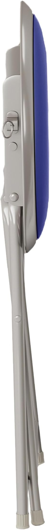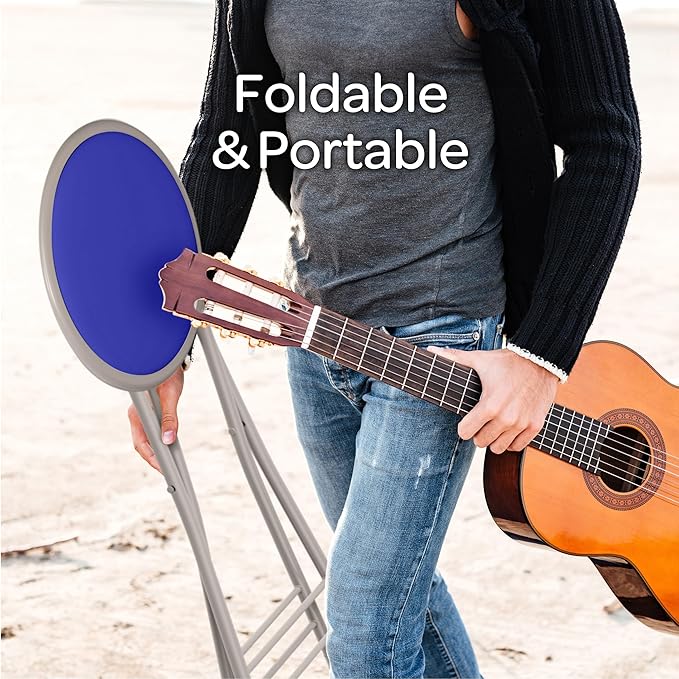• PRODUCT DETAILS - Materials: PVC and Steel. Dimensions: (L) 12" x (W) 11.75" x (H) 18"; Folded: (L) 12.5" x (W) 2" x (H) 28"; Seat Diameter: 12.5". Weight Capacity: 225lbs. Intended for Indoor Use Only. Color: Royal Blue and Silver.