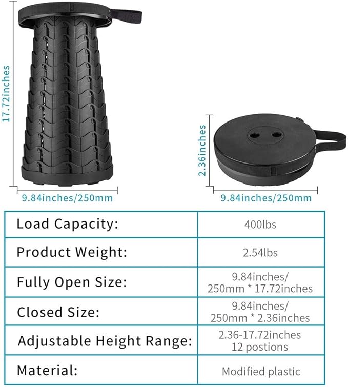 • PORTABLE & LIGHTWEIGHT: This telescopic stool is only 2.54 pounds with dimeter 9.84 inches/250mm. The adjustable strap makes the stool easy to carry in your hand or hanging on your shoulder. Perfect to use for camping, fishing, hiking, hunting, picnic, BBQ. Also can be used in living room, bedroom, bathroom etc