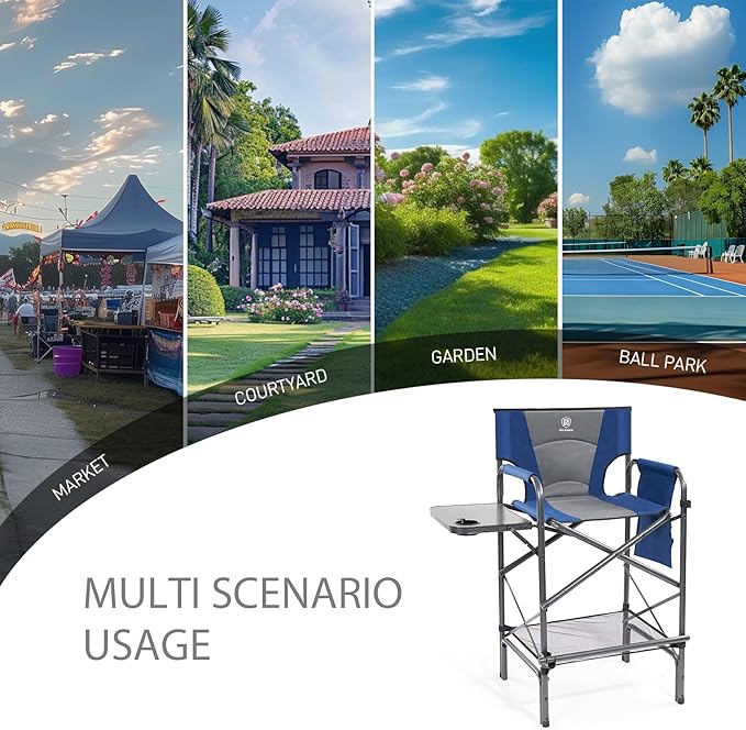 EVER ADVANCED Tall Folding Chair 30.7" Seat Height Directors Chair High Foldable Bar Stool for Makeup Artist Face Painting with Side Table Cup Holder and Storage Pocket Supports 350LBS (Blue/Grey)