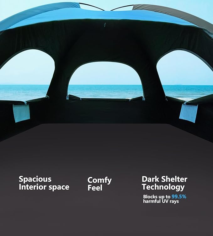• Outdoor Activities Protection & Great Ventilation - Premium 210D sun-proof materials, with embedded coated polyester lining within, are able provide great UV protection (UPF 50+) and reflect or block up to 98% of unhealthy UV rays. The 3 large mesh windows provide excellent airflow to keep the tent nice and chill inside. So you can feel the breeze from the ocean, stay cool in the summer heat wave, and enjoy a comfortable and cozy sun shelter with your family and friends.