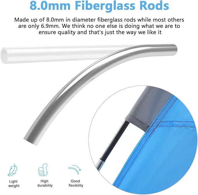 • Good Flexibility & Higher Durability - Fiberglass rods increased from 6.9 millimeter (market standard) to 8.0 millimeter for a more flexible and durable framework when installing in the shade. Dependable and reliable rods are essential, therefore we made this change in order to extend the rod’s lifespan, just to ensure our fiberglass rods can withstand multiple usage even after a long period of time.