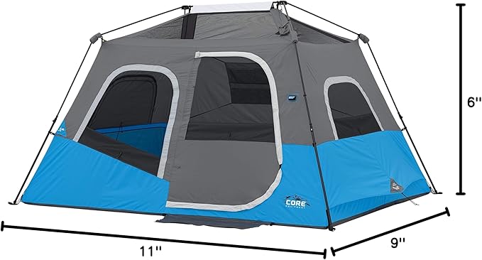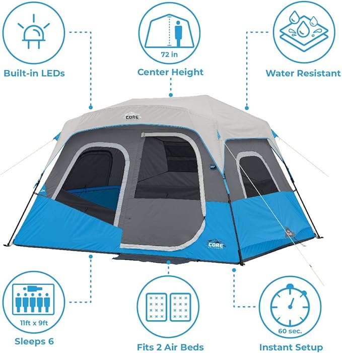 CORE Instant Cabin Tents with LED Lights | 6 Person / 9 Person / 12 Person Family Multi Room Lighted Pop Up Tents for Camping | Included Storage Pockets for Camping Accessories