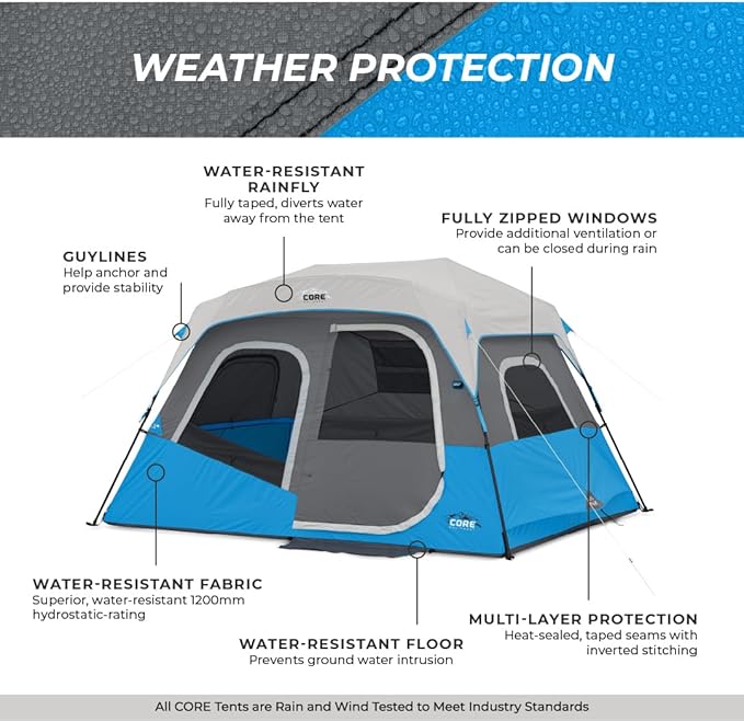 • WEATHER PROTECTION: H20 Block Technology with 1200mm fabric, fully taped rainfly, sealed seams, and fully zipped windows; includes guylines and steel stakes for enhanced stability