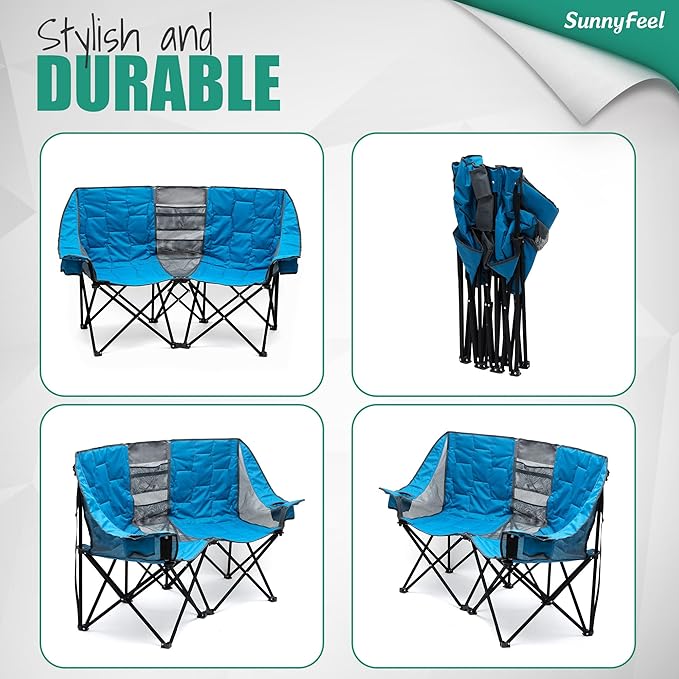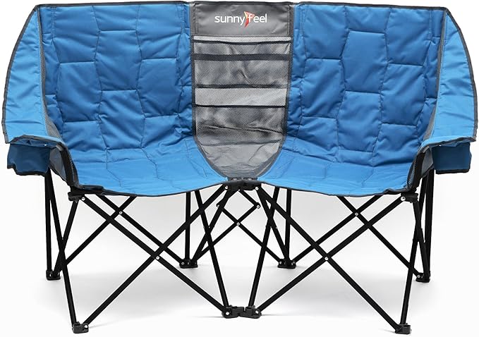 SUNNYFEEL Folding Double Camping Chair, Oversized Loveseat Chair, Heavy Duty Portable/Foldable Lawn Chair with Storage for Outside/Outdoor/Travel/Picnic, Fold Up Camp Chairs for Adults 2 People
