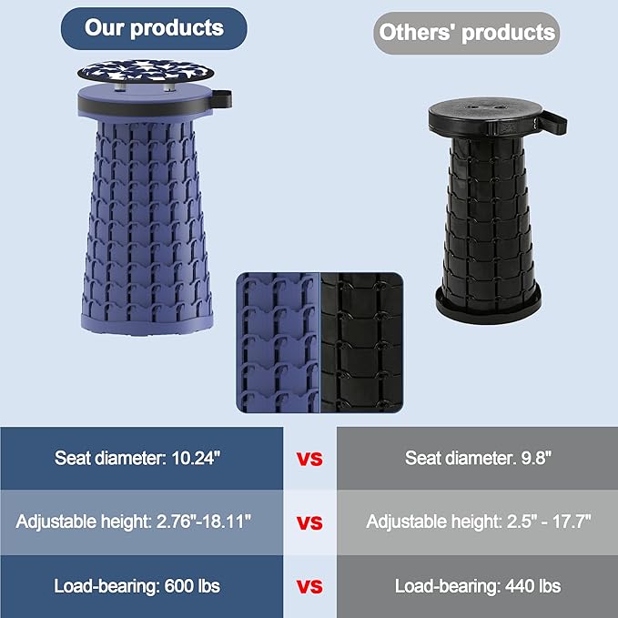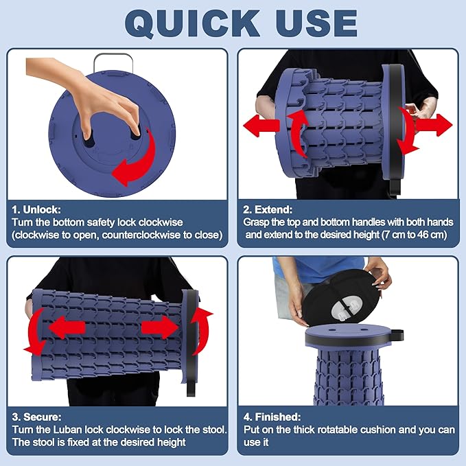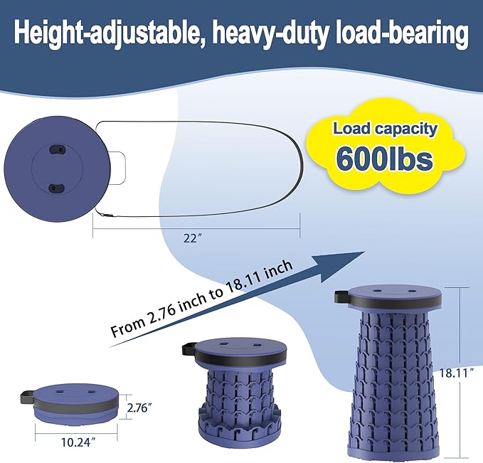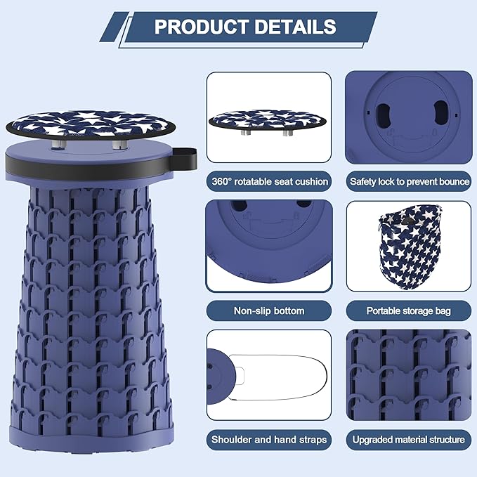 • 【2025 New Upgraded Folding Stool】Our redesigned, U.S. patented Portable Collapsible Stool Telescopic Seat Camping Chair more securely than previous versions and is made from durable, heavy-duty, recyclable high-molecular-weight polypropylene for a safer, more solid seating experience.