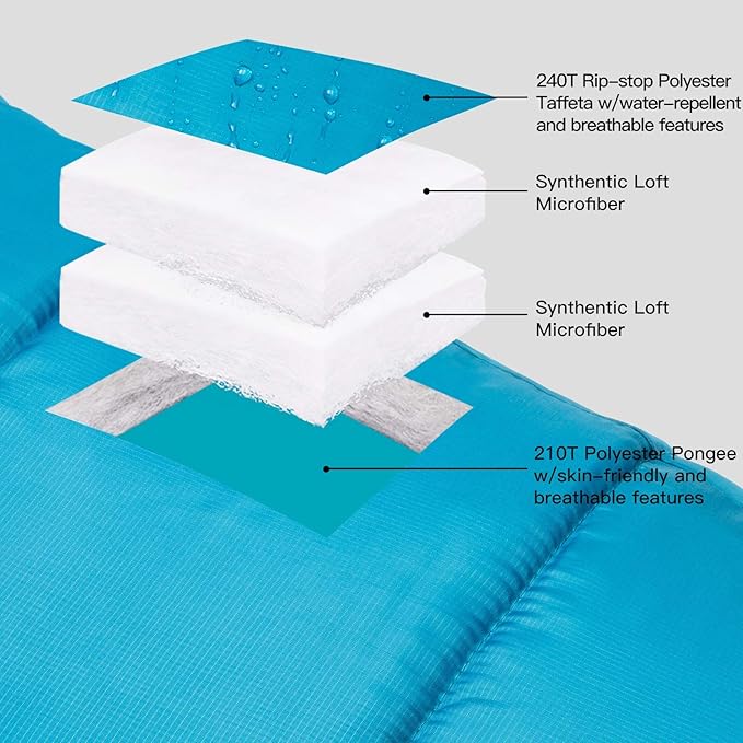 • Water Resistant & Comfort: Lining adopt 240T Rip-stop Polyester Taffeta water-repellent and breathable features, it effectively increases the toughness of the sleeping bag. and with double layer synthetic loft microfiber,provides greater comfort for your body.