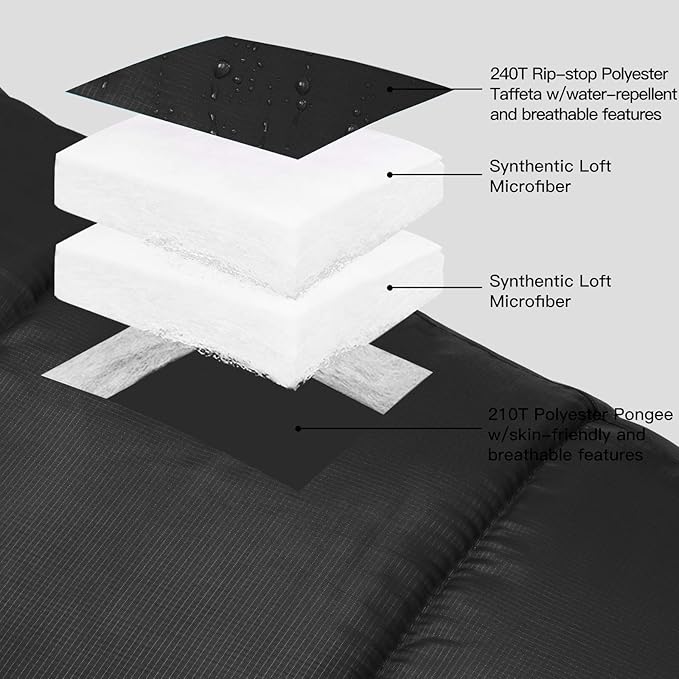 • Water Resistant & Comfort: Lining adopt 240T Rip-stop Polyester Taffeta water-repellent and breathable features, it effectively increases the toughness of the sleeping bag. and with double layer synthetic loft microfiber,provides greater comfort for your body.
