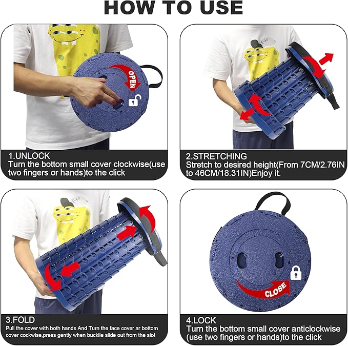 • 【Safaty and Sturdy】 Made of high-strength heavy duty environmental material plastic PP, the cylinder shape structure, tight connecting clasps, and the non-slip base ensure that this collapsable stool will give the stability to provide safe and comfortable sitting. The maximum load capacity is as much as 600 Lbs(270kg) ATTENTION: Please sit in the center of the seat. DO NOT sit on the edge of the seat. DO NOT tilt the stool.not sweep down!