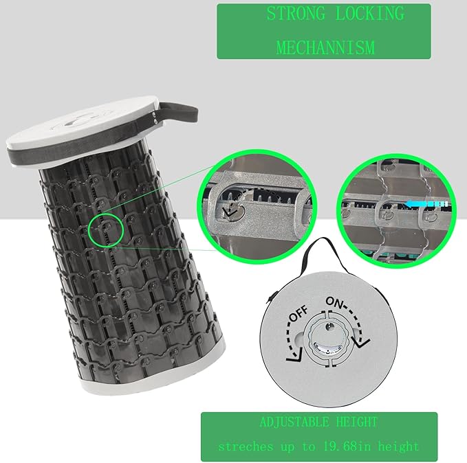 • 【 Adjustable Height Range2.75"-19.7"】The Upgraded Collapsible stool is adjustable and it can be set to your desired height within the range of 2.75 to 19.7 inches. This adjustability makes it suitable for most adults use anywhere! yet more sturdy loading capacity 1000LBs.
