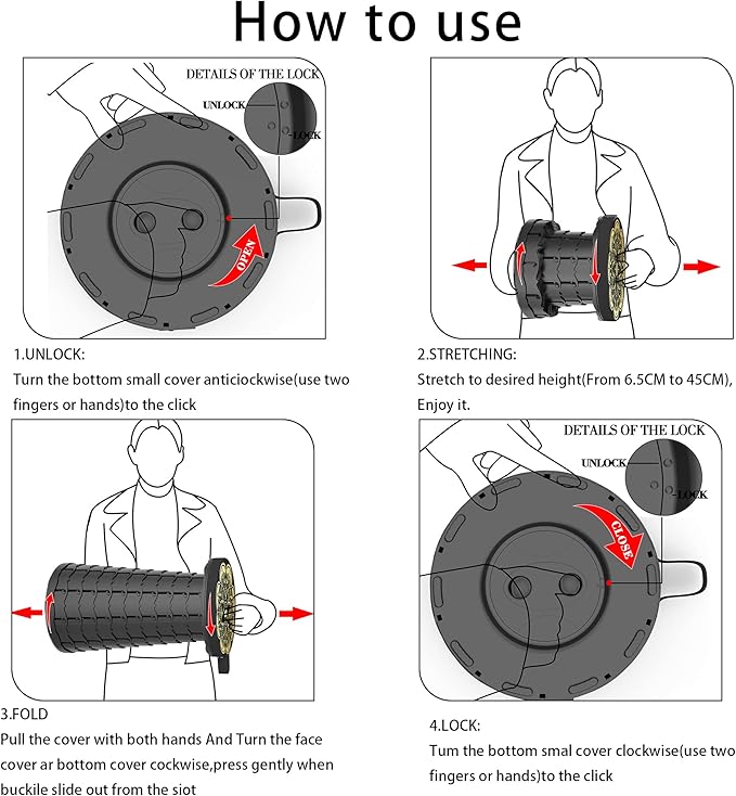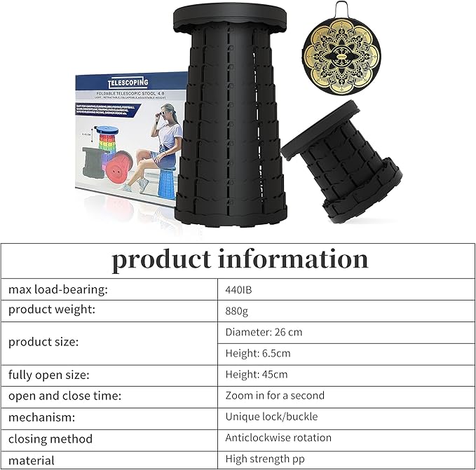 • 【Safety & High Stability】 Portable stools for adults heavy duty is made of high-strength material plastic PA+ABS, the cylinder shape structure, tight connecting clasps, and the non-slip base ensure the stability of collapsible stool. The maximum load capacity is as much as 440lbs!