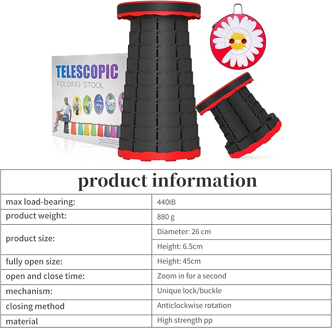 • 【US PATENT Latest Design】 Unique structure of patented design allows the telescopic stools for adults to open and close easily in just seconds, and it locks firmly in place once opened. Comfortable convenience and safety! These are really achieved through careful structural design.