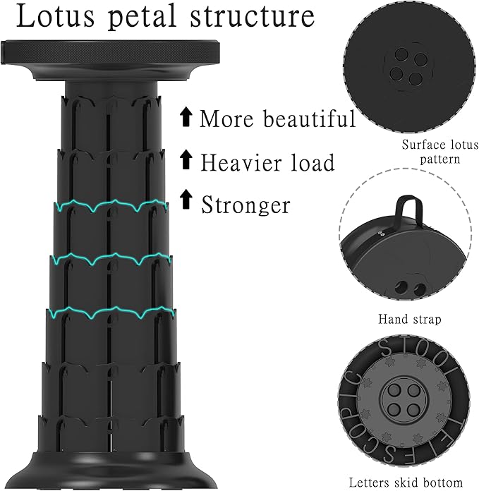 • 【Safety and High Stability】 Made of high-strength heavy duty environmental friendly material plastic PP, the cylinder shape structure, tight connecting clasps, and the non-slip base ensure the stability of collapsible stool. That provides safe and comfortable seat. The maximum load capacity is as much as 550 lbs(250kg)!