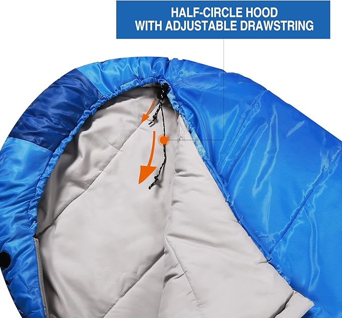 • Adjustable Length: There is an extra zipper near the bottom of the camping sleeping bag. It makes the sleeping bag can be adjusted to L55''/140cm, which size is more suitable for kids. Provide them with better warmth and coziness.