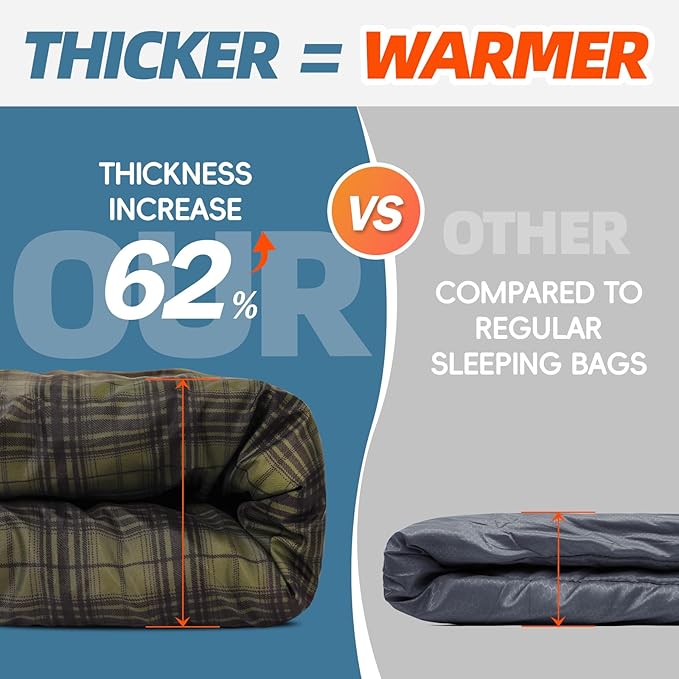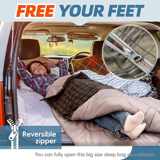 • GET MORE SPACE : Roomy rectangular shape comfortably fits most campers up to 7 FEET. Size: 33.5 by 90.5 inches (W x D), 20% larger than most products on the market, so lofty and wide you'll have plenty of room to stretch out. The separated bottom zipper lets you ventilate the foot section for better temperature control, you can even fully open this big size sleep bag as a blanket