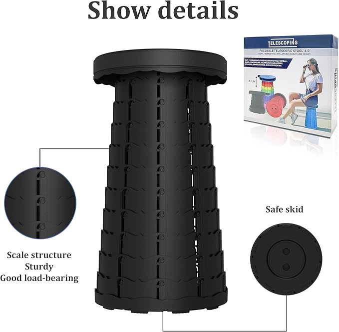 • 【Safaty and Sturdy】 Made of high-strength heavy duty environmental material PP, the cylinder shape structure, tight connecting clasps, and the non-slip base ensure that this collapsable stool will give the stability to provide safe and comfortable sitting. The maximum load capacity is as much as 440 lbs(200kg) ATTENTION: Please sit in the center of the seat. DO NOT sit on the edge of the seat. DO NOT tilt the stool.not sweep down!