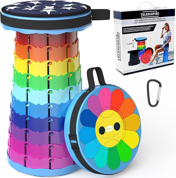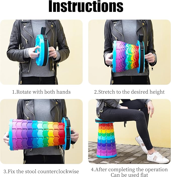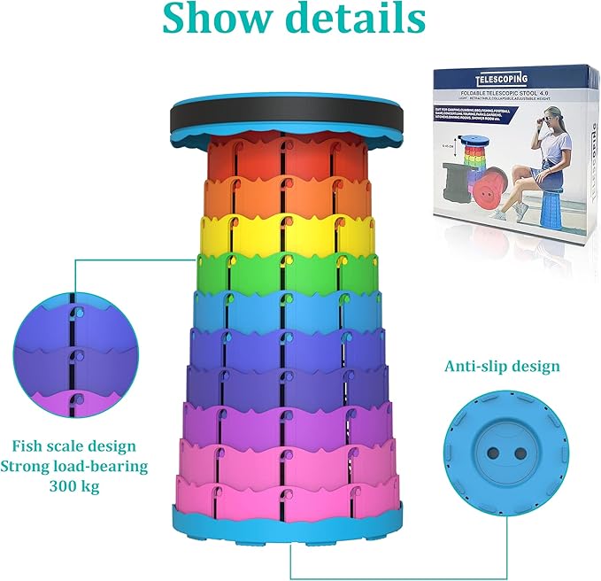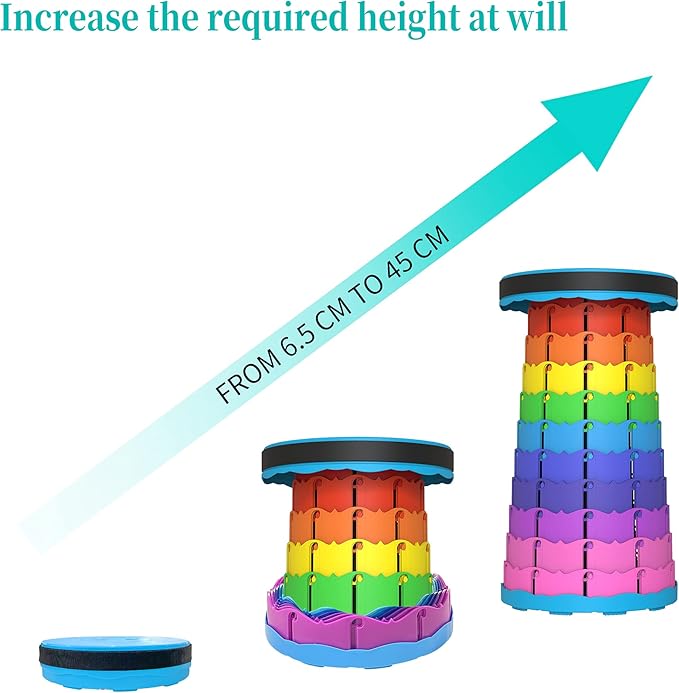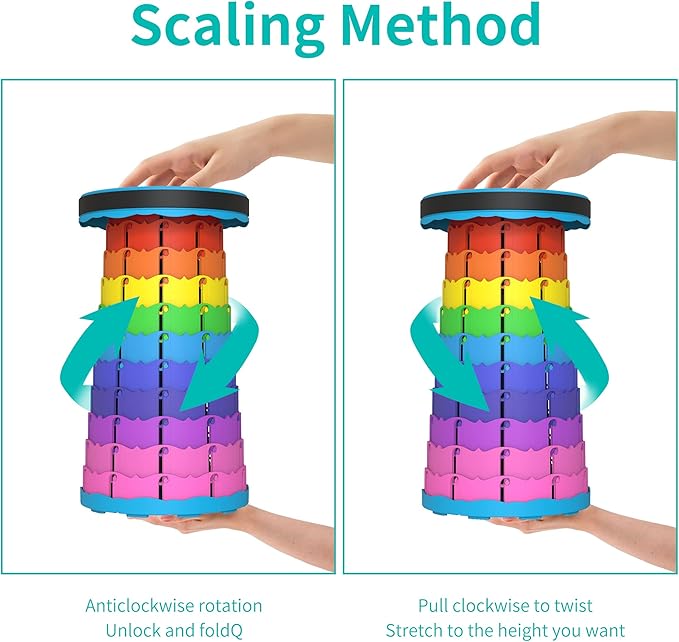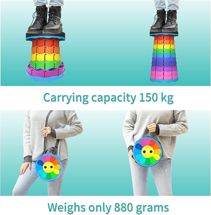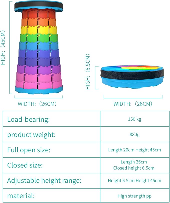 • 【Safaty and Sturdy】 Made of high-strength heavy duty environmental material PP, the cylinder shape structure, tight connecting clasps, and the non-slip base ensure that this collapsable stool will give the stability to provide safe and comfortable sitting. The maximum load capacity is as much as 440 lbs(200kg) ATTENTION: Please sit in the center of the seat. DO NOT sit on the edge of the seat. DO NOT tilt the stool.not sweep down!