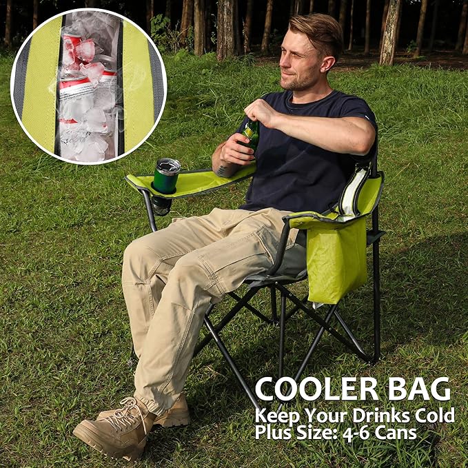 VILLEY Camping Chair, Oversized Folding Camp Chair, Portable Outdoor Chairs Support 450 LBS with Padded Seats, Cooler Bag, Cup Holder, Carry Bag, Green