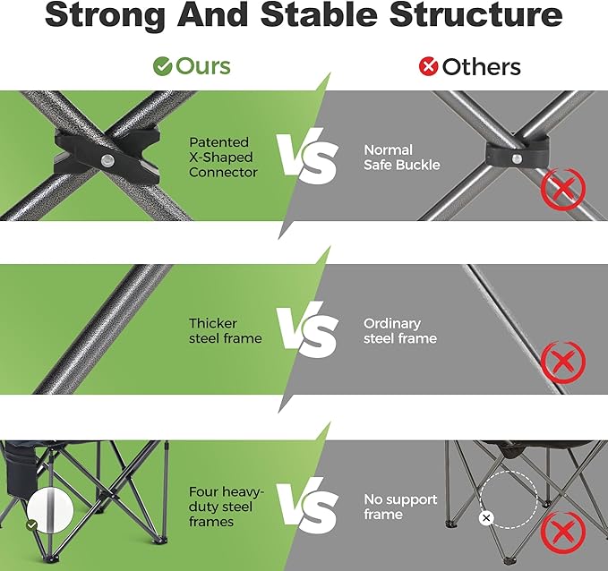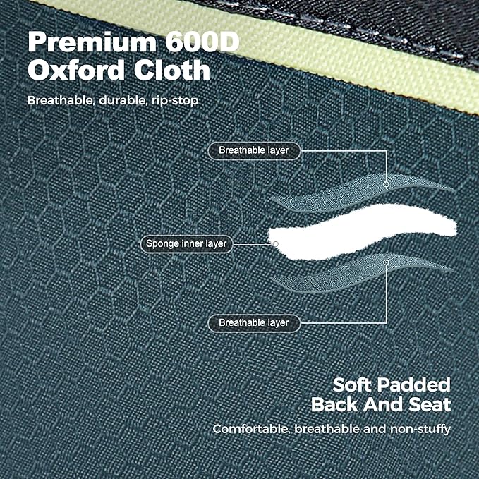 • HIGH QUALITY CAMPING CHAIR : Ergonomic padded back ,600D padded oxford fabric , durable powder-coated steel tube frame and armrests , high-quality materials only provide you with a comfortable and safe chair . Weight Capacity: 450 LBS , stable and strong