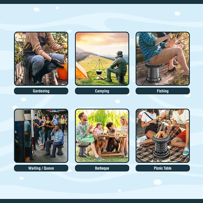 • 🔥【ENDLESS OPTIONS】NUMANU's Portable Telescopic Collapsible Folding Stool has many usage options such as: Camping, Hiking, Waiting in Line, Gift, Live Concert Events, Plumbing, Construction, DIY/Fixing, Fishing, Gardening, Resting, Travel, Commuting, Bus, Train, Subway and More.