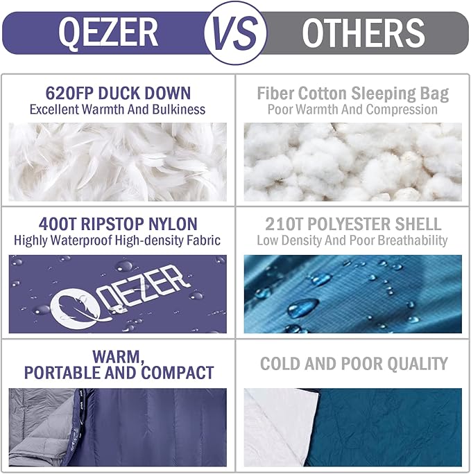 • 【 𝐒𝐀𝐓𝐈𝐒𝐅𝐀𝐂𝐓𝐈𝐎𝐍 𝐆𝐔𝐀𝐑𝐀𝐍𝐓𝐄𝐄 】QEZER always provides our customers with the best sleeping bag products and services with stylish design, premium down and more perfect outdoor functions. If you have any product questions, please contact us via Amazon and provide your order number, we will respond sincerely and do our best to keep you satisfied.
