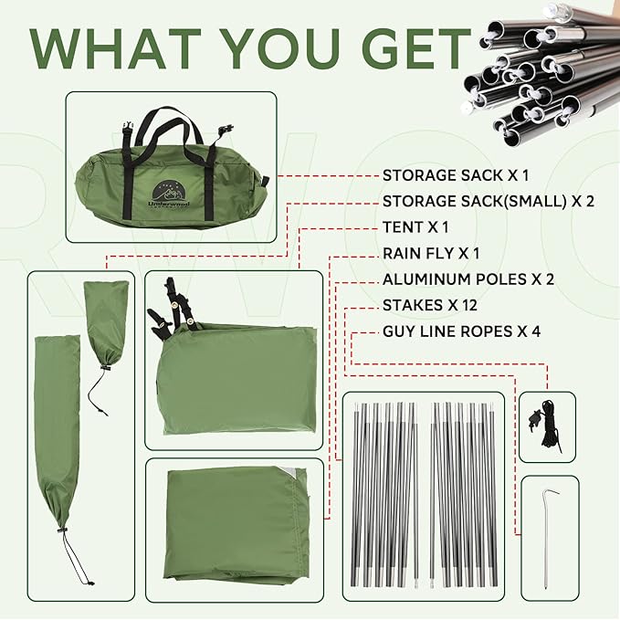 • Included Components : 1*TENT, 1*RAIN FLY, 12*STAKES, 2*ALUMINUM POLES, 4*GUY LINE ROPES