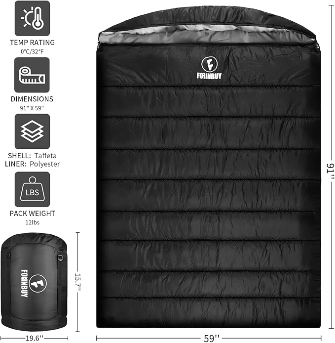 • 【SUPER HUGE SIZE】–Economically and practically efficient;with an impressive 90 X 59 inches (230x150cm) size, this camping double sleeping bag can hold 2 people (maximum body type: 5.9ft, 180lbs). Sufficient space, providing ideal conditions for sharing warm time. For couples or family who want to go camping together,FORINBUY two person sleeping bags is a nice a nice option.Also the imitation cotton liner is especially friendly to skin sensitive user .