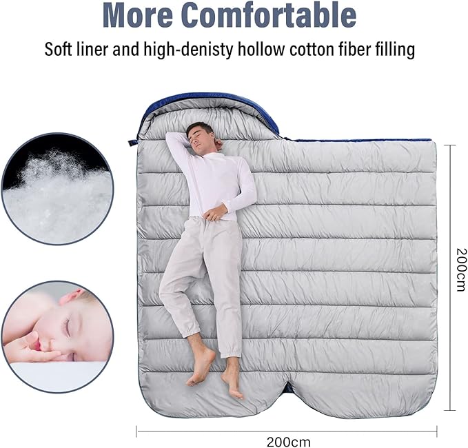 • 【ENJOY THOUGHTFUL DESIGN】We use 190T polyester as the surface material and hollow fiber as the filler. The skin-friendly sponge lining is especially suitable for sensitive skin. This soft, comfortable, skin-friendly, and waterproof sleeping bag can ensure that you can spend a relaxing and pleasant night after a day of camping, walking, hiking, or other exploration.