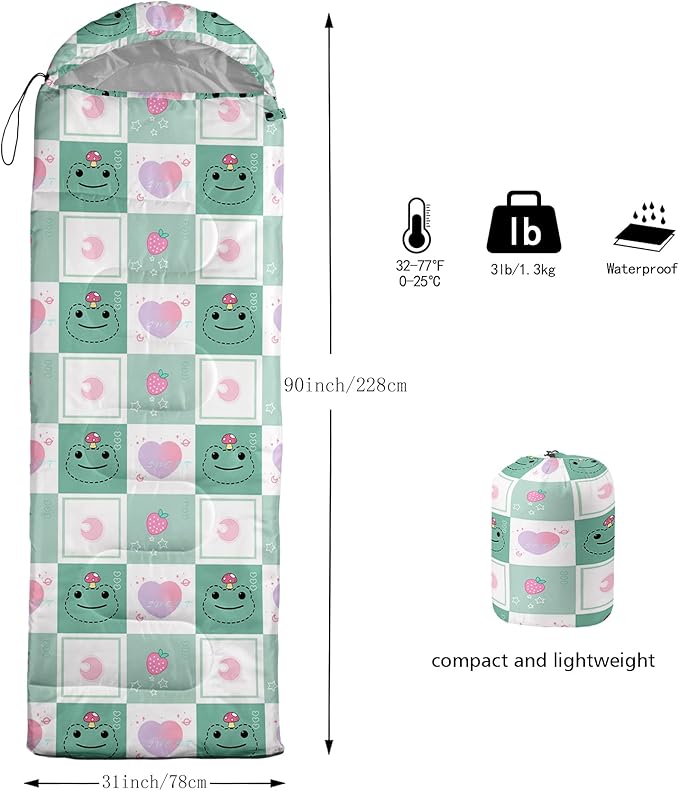 • FITS FOR 3 SEASONS: SIZE - 31 by 90 inches (W x D). Our sleeping bag can be used in 3 seasons with a design temperature of 32℉-77℉(0℃-25℃). These bags also have a weather resistant waterproof design to keep you warm and prevent you from any dampness.