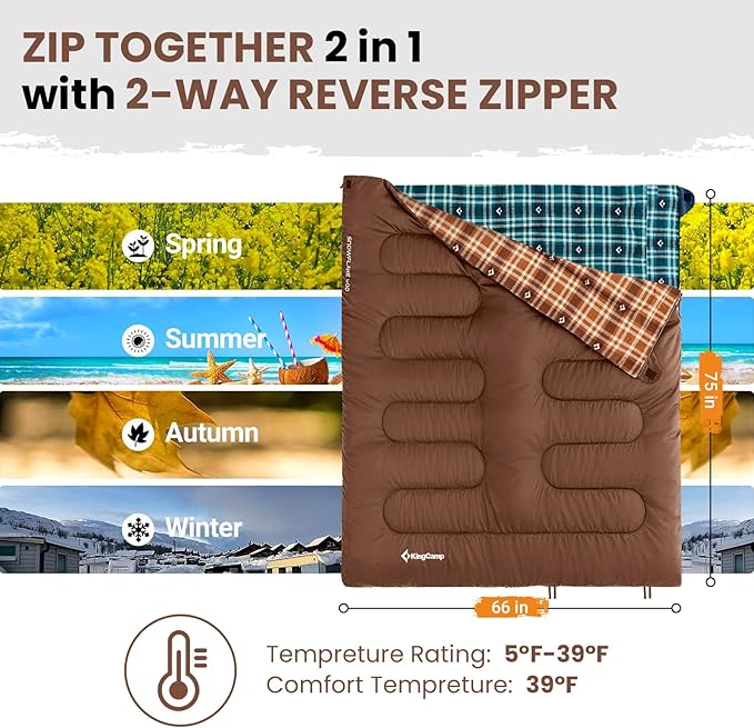 • MULTIFUNCTIONAL DESIGN-More Than Just a Sleeping Bag: This versatile sleeping bag offers more than just a place to sleep! The 2-way zippers allow you to zip two sleeping bags together for couples or family camping. Unzip the bottom for extra ventilation to cool your feet on warmer nights. Not only can it be used as a sleeping bag, but it can also be transformed into a blanket or picnic mat for family trips. Plus, it's machine washable, making cleaning a breeze for frequent use.